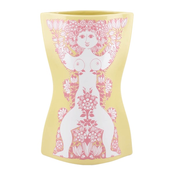 Bjørn Wiinblad Nina vas 22 cm gul/rosa är ett dekorativt konstobjekt i keramik, där kvinnokroppen tolkas genom en poetisk form och en färgstark yta. Designen är inspirerad av Wiinblads ursprungliga illustrationer och vidareutvecklad som en hyllning till det feminina – med sensuella kurvor, rik blomsterdekor och ett grafiskt uttryck som fångar blicken direkt.