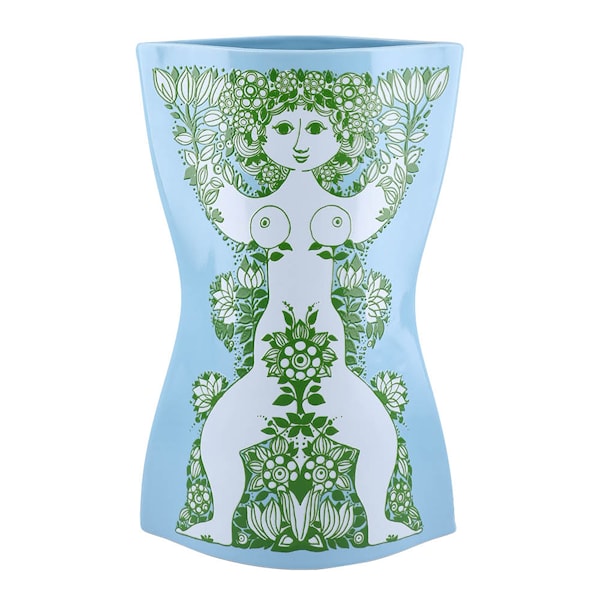 Bjørn Wiinblad Nina vas 28,5 cm i ljusblått och grönt är ett levande konstföremål i keramik, skapat med inspiration från Wiinblads ursprungliga verk. Formgiven av det kreativa teamet bakom Bjørn Wiinblad-studion är vasen en hyllning till kvinnokroppen – fyllig, blomstrande och uttrycksfull. Den symmetriska kompositionen med florala detaljer och grafisk dekor gör Nina till ett självklart blickfång i rummet.