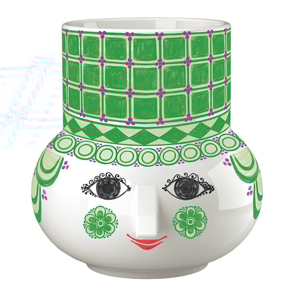 Ljusstaken Olga 12 cm grön från Bjørn Wiinblad är ett livfullt och dekorativt objekt för blockljus, värmeljus eller kronljus. Den rundade formen, glada ansiktet och färgstarka dekoren ger ett poetiskt uttryck i alla rum.