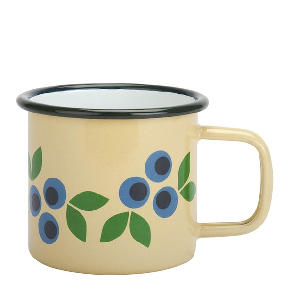 Blafres blåbärsmugg i emalj är liten, lätt och redo för äventyr. Med sitt lekfulla blåbärstryck är den en perfekt mugg för skogsutflykter, bärplock och varma drycker i naturen.