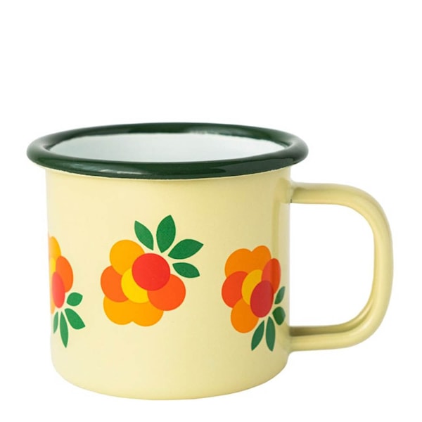 Blafres emaljmugg med hjortronmotiv rymmer 25 cl och är en fin följeslagare för både barn och vuxna. Använd den till varm choklad eller fyll den med bär direkt från naturen.