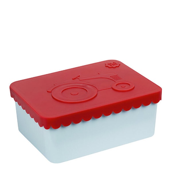 Praktisk matlåda i röd och ljusblå plast från Blafre, dekorerad med traktormotiv i relief på locket. Lådan är 6x11x14 cm och har ett fack med plats för 3–4 smörgåsar. Den fungerar även som avdelare i Blafres metallkoffertlådor.