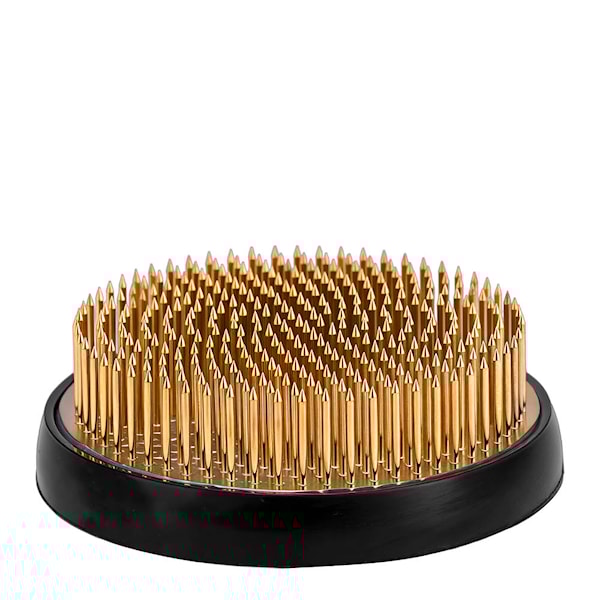 Stjälkarna placeras på små kopparpiggar och hålls stadigt tack vare den tunga basen. Den större diametern på 8 cm gör den lämplig för mer omfattande arrangemang och ger god spridning mellan stjälkarna.