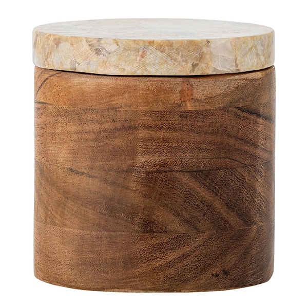 Kombinationen av varma trätoner och sval marmor ger burken ett exklusivt uttryck som fungerar i alla rum – från kök till sovrum. Varje burk har naturliga variationer som gör den unik.