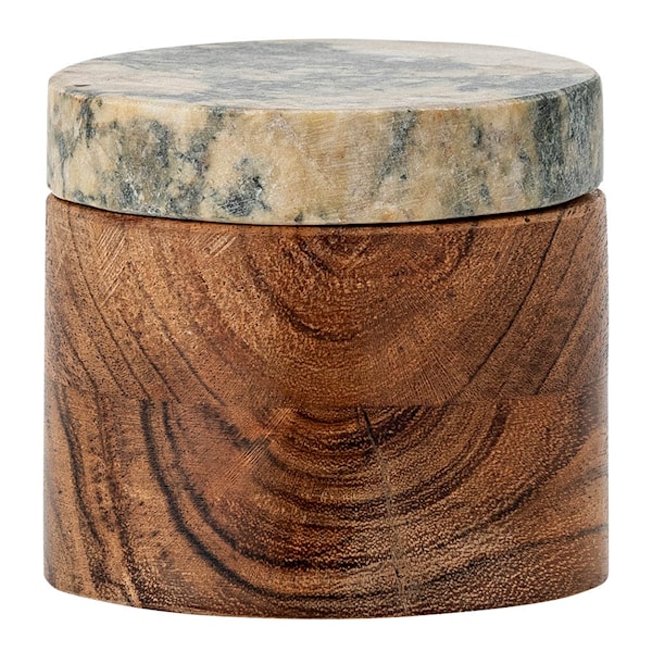 Den kompakta storleken gör den perfekt för småsaker i köket, badrummet eller hallen. Marmorlocket ger en exklusiv känsla och skyddar innehållet, medan träets naturliga ådring gör varje burk unik.
