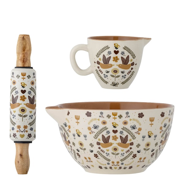 Bryn bakset från Bloomingville MINI är ett stilrent set i stengods som uppmuntrar barn att delta i köksaktiviteter. Innehåller tre delar: en kavel, ett decilitermått (2 dl med 1 dl-markering) och en skål. Kommer i en vacker presentask – en perfekt gåva till det lilla matlagningsintresserade barnet.