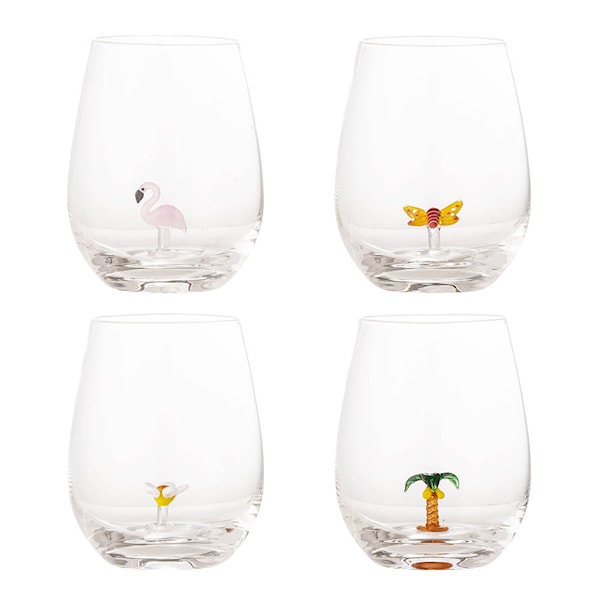 Misa dricksglas från Bloomingville är ett livfullt fyrpack med munblåsta glas, där varje glas har en liten handgjord figur i botten – en flamingo, en fjäril, en blomma och en palm.