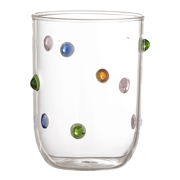 Thalia dricksglas från Bloomingville rymmer 40 cl och tillför dukningen ett färgstarkt och livfullt inslag. Varje glas är munblåst och dekorerat med små färgade glaspärlor, vilket ger varje glas en unik och lekfull karaktär. De handplacerade dekorationerna gör att inget glas är det andra likt och skapar en personlig touch vid bordet.
