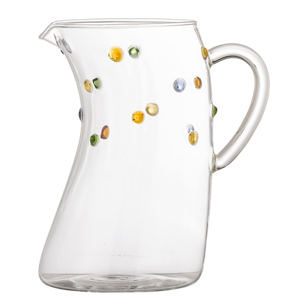 Thalia kanna från Bloomingville rymmer 1,3 liter och är ett dekorativt inslag på bordet – oavsett om det är till vardag eller fest. Kannan är munblåst och dekorerad med små färgade glaspärlor som har placerats för hand. Det ger varje kanna ett unikt uttryck och tillför en lekfull men samtidigt stilren känsla.