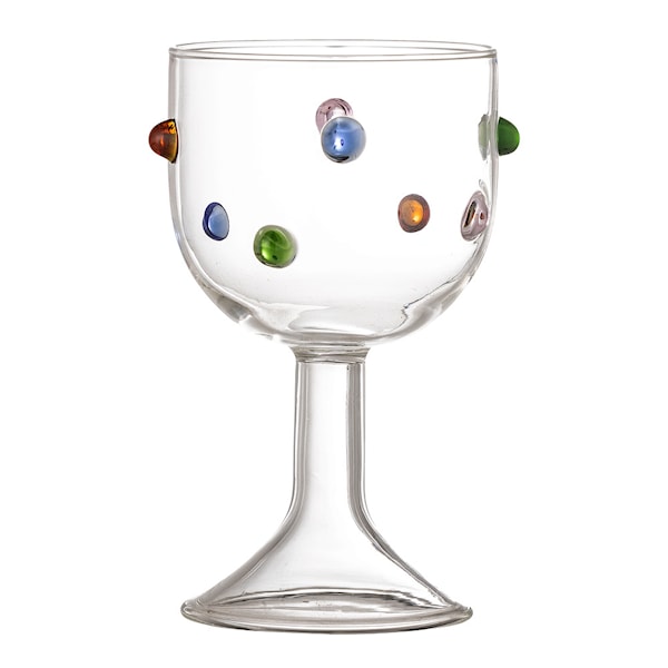 Thalia vinglas från Bloomingville rymmer 25 cl och utmärker sig med sin lekfulla design och praktiska storlek. Glaset är munblåst och dekorerat med små, färgade droppar i massivt glas, varsamt placerade för hand. Det gör varje glas unikt – något som ger en extra speciell känsla, oavsett om det används till vardags eller vid festliga tillfällen.