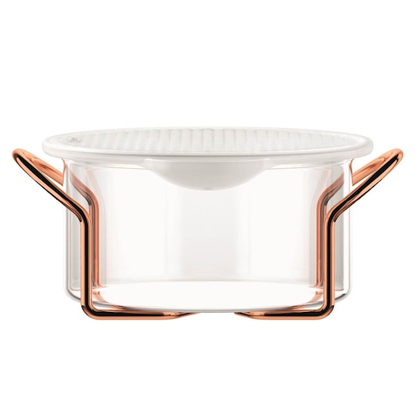 Silikonlocket sluter tätt och kan användas för både kyl- och frysförvaring. Vänder du det upp och ned fungerar det dessutom som ett underlägg vid servering. Den minimalistiska formen och det kopparfärgade stativet gör skålen lika attraktiv på matbordet som i köket, och borosilikatglasets klara yta bevarar sin glans över tid.