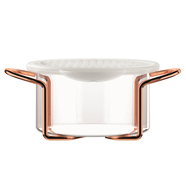 Det kopparfärgade stativet ger skålen stabilitet och ett elegant uttryck, samtidigt som silikonlocket gör det enkelt att förvara innehållet i kyl eller frys. Vänd locket upp och ned, och det fungerar som en liten serveringsbricka. Glasdelen tål maskindisk och håller sig klar och fin vid daglig användning.