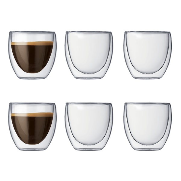 Pavina Espressoglas dubbelväggad 8 cl 6-pack från Bodum är ett litet glas med dubbla väggar vilket gör att din dryck håller sig varm längre samt att du slipper bränna fingrarna.