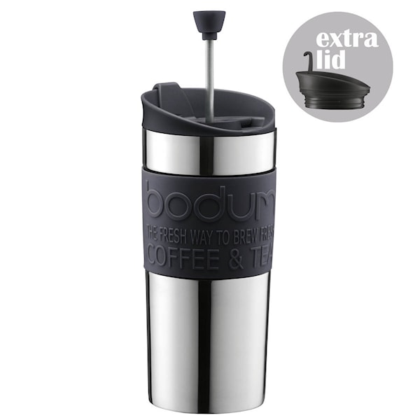 Njuta av kaffe i farten - det är en rättighet alla borde ha! Därför har Bodum gjort din morgonrutin ännu smidigare. Istället för att köa på kaféet, kan du nu brygga ditt eget kaffe i hemmet medan du förbereder dagen. Fyll muggen, värm vatten och inom fyra minuter har du ett nybryggt kaffe med fyllig arom. Pressa ner stämpeln och du är redo att ge dig av. Muggen med dubbla väggar ser till att kaffet håller sig varmt, även under kalla vinterdagar. Tillverkad av plast, gummi, silikon och rostfritt stål, tål diskmaskin. Ett extra lock ingår. Observera att de inte är helt täta. Mått: Volym: 0,35 L Höjd: 18,5 cm Bredd: 8 cm Längd: 9 cm. Bodums vision är att erbjuda kvalitetslösningar för kaffe och te samt hushållsprodukter som speglar dina värderingar. Med funktion och form i fokus strävar Bodum efter att erbjuda stilren design till bra priser, med ett ständigt engagemang för hållbarhet och ansvar för både människor och miljö.