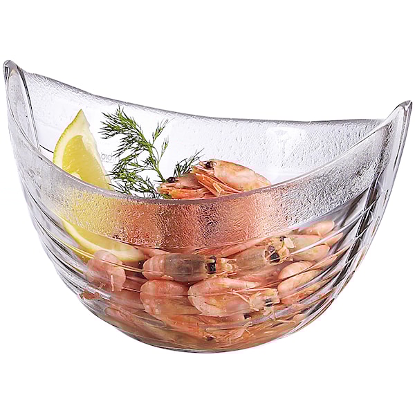 Skålen mäter 22 cm i längd och 15,5 cm i bredd och är tillverkad i klarglas som tål maskindisk. Utöver räkor passar den utmärkt för sallader, chips eller frukt.