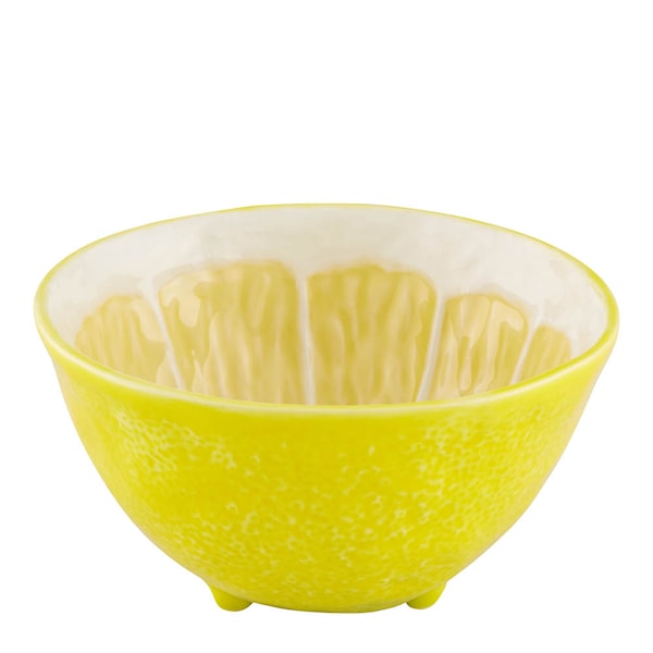 Bordallo Pinheiros citronskål i stengods är 15 cm i diameter och designad med inspiration från naturen. Med sin detaljerade utformning och glansiga glasyr är den idealisk för servering av smårätter, glass, frukt eller nötter. Dess citronform ger ett friskt och oväntat inslag till dukningen.