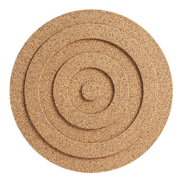 Runt grytunderlägg med cirklar, formgiven av Veronica Vejsholt för Born in Sweden. Underlägget är tillverkat av återvunnen kork från vinkorkindustrin och blir med sitt grafiska mönster en både snygg och praktisk inredningsdetalj.