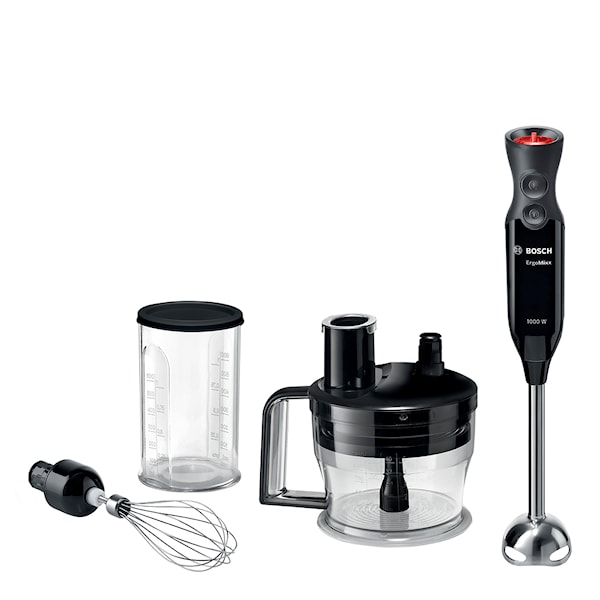 Stavmixern är effektiv med sina 1000 W och är utrustad med skarpa QuattroBlade-knivar i rostfritt stål. Du avlägsnar med ett enkelt tryck alla tillbehör och rengör dem sedan enkelt i diskmaskin.
