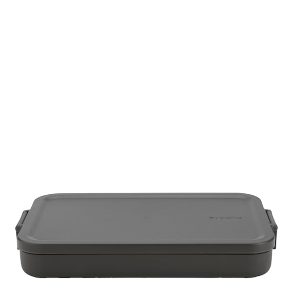 Brabantia Make & Take matlåda i mörkgrå färg är en plattare matlåda som är perfekt för dig som behöver en låg matlåda som tar minimalt med plats. Den platta formen (3,7 x 16,6 x 25,5 cm) gör att den enkelt ryms i väskan, utan att kompromissa med innehållet.