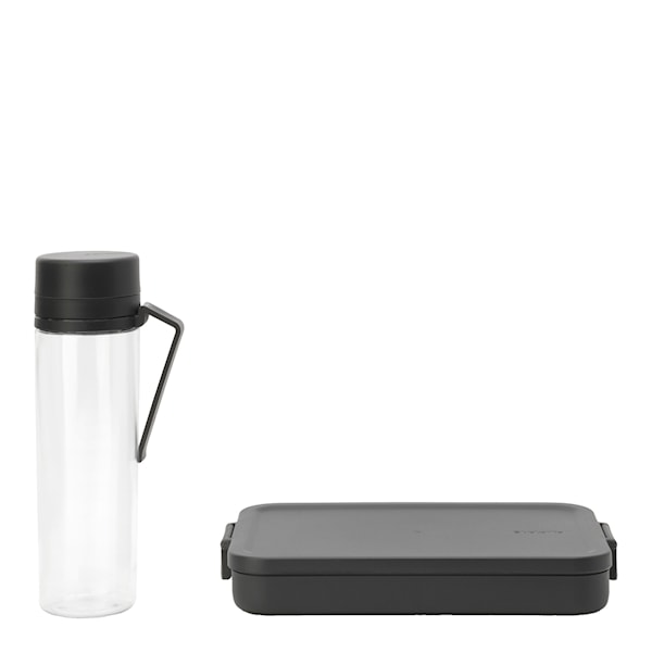 Brabantia Make & Take Break set 2 delar är ett praktiskt val för dig som vill ha både mat och dryck med dig i en kompakt lösning. Matlådan har en platt form och ett pålitligt klämlock, medan vattenflaskan på 500 ml är utrustad med sil som håller frukten på plats.