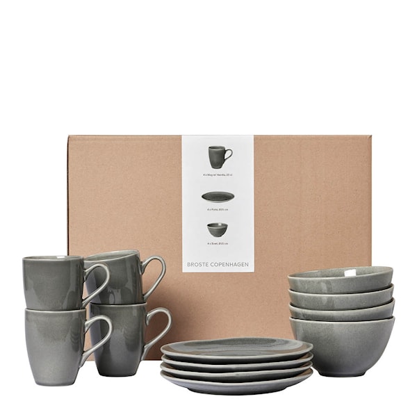 Setet består av fyra middagstallrikar på 26 cm, fyra tallrikar på 20 cm och fyra skålar på 17 cm. Det levereras i presentförpackning och passar perfekt som startset eller som en genomtänkt gåva till exempelvis bröllop, jubileum eller inflyttning.