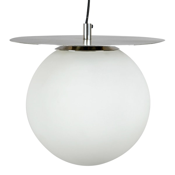 En stilren lampa med ett vitt klot och en rund silverplatta att hänga i taket. Passar bra i ett stilrent och klassiskt hem. Matcha med vägglampan Lush.