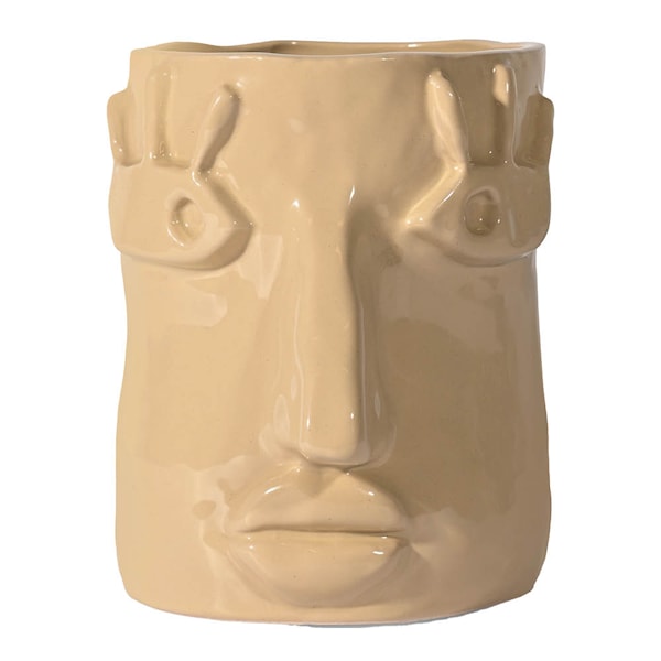 Facy i mindre format är ett konstverk i sig, skapat för att ge karaktär åt varje vrå. Det skulpterade ansiktet fångar ljus och skuggor på ett sätt som gör att krukan lever i rummet. Tillverkad i stengods med hantverksmässig känsla får varje exemplar sin egen särprägel.