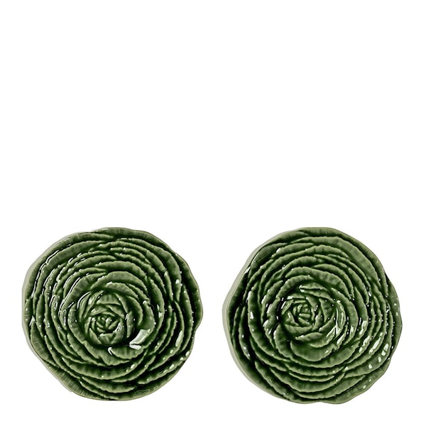 Veggie är ett charmigt set med två glasunderlägg formgivna i stengods, inspirerade av grönkålens böljande blad. De skyddar effektivt bordet från fukt och ringar, men är också fina att servera praliner eller andra små godsaker på.