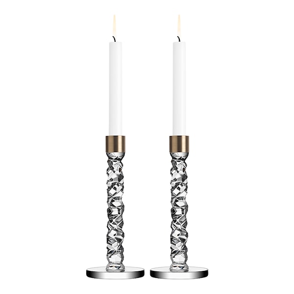 Dessa Orrefors ljusstakar är gjorda i kristallglas med asymmetriskt slipade fasetter som reflekterar ljuset och skapar en levande atmosfär. De metalliska detaljerna ger en modern kontrast, och den 24,2 cm höga modellen är idealisk som mittpunkt i inredningen eller på det dukade bordet.