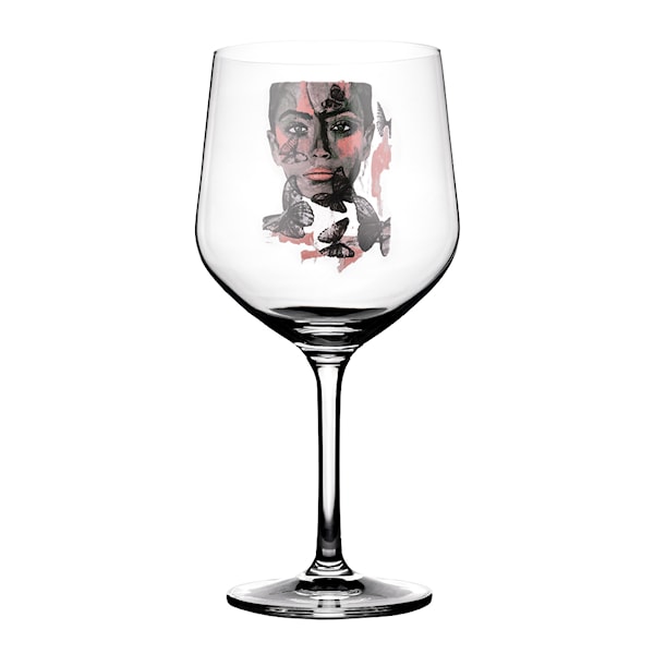 Carolina Gynnings konstnärliga motiv Butterfly Queen pryder detta 72 cl-drinkglas, utfört med elegans i guldskimrande toner.