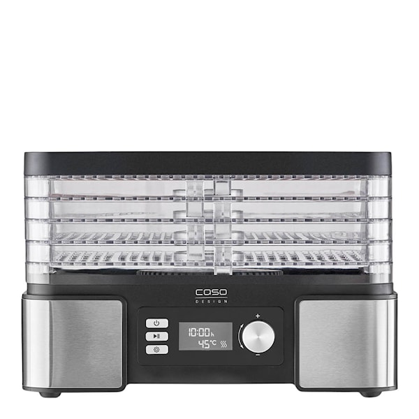 Caso DH 450 dehydrator med 5 hyllor i stål och svart gör det möjligt att torka livsmedel hemma på ett enkelt sätt. Den moderna designen kombinerar kompakt storlek med praktiska funktioner, vilket gör att apparaten passar bra i köket. Dehydratorn kan användas för frukt, grönsaker, örter, svamp, kött och nötter.