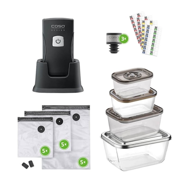 Caso Vacu OneTouch Pro vakuumset i svart är ett praktiskt startpaket för vakuumförpackning av mat och dryck. Setet innehåller en Vacu OneTouch Pro handvakuumerare, 15 zip-vakuumpåsar, fyra vakuumbehållare i glas samt tre WineLock-proppar för flaskor. Tillsammans ger detta många möjligheter för smart förvaring i köket.