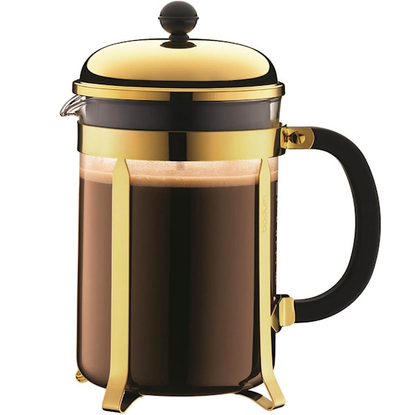 Kannan är tillverkad av värmetåligt borosilikatglas som bevarar kaffets rena smak, och ramen i rostfritt stål ger en elegant och tidlös känsla. Du kan välja mellan den klassiska finishen i krom eller den mer exklusiva i guld. Med det traditionella pressystemet får du en aromrik kopp kaffe – helt utan pappersfilter eller kapslar.