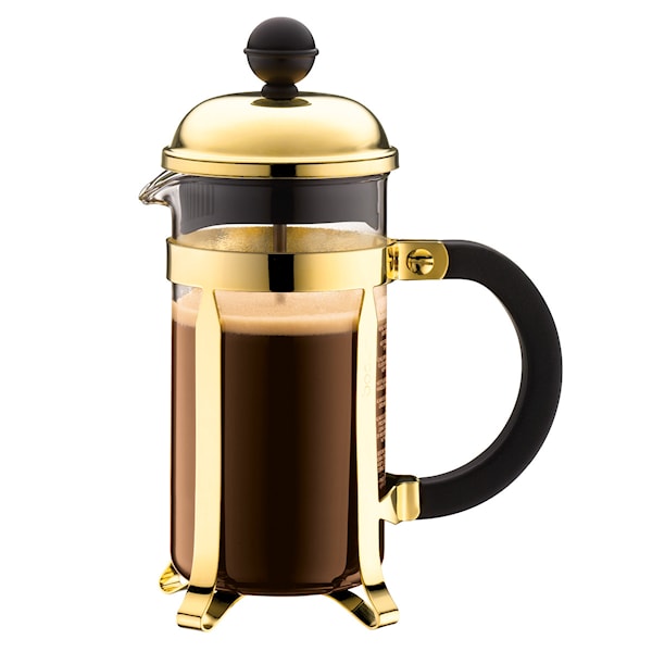 En klassisk kaffepress med hög kvalitet. Med vatten mellan 92 och 96 grader tar det fram det allra bästa i alla typer av kaffe. Inte nog med att den brygger gott kaffe, den är även riktigt snygg och lyxig att servera ur. Rymmer 35 cl och ger 3 koppar kaffe. Välj mellan krom, guld eller kopparfärgat stativ.