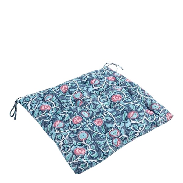 Chamois Apple sittdyna 40x40 cm blå är en mönstrad sittdyna med ett levande uttryck. Mönstret är tryckt med indisk blockteknik, en traditionell metod där varje del av motivet appliceras för hand. Det ger naturliga variationer och en unik karaktär i varje exemplar.