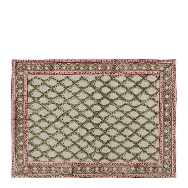 Varje tablett pryds av ett handtryckt mönster, framställt med traditionell indisk blockprint. Tekniken ger varje exemplar sin egen unika prägel och gör helheten levande. En dekorativ bård ramar in designen och skapar en elegant balans på bordet.