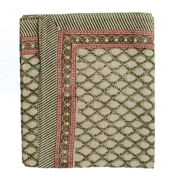 Det eleganta mönstret är tryckt för hand med traditionell indisk blockprintteknik. Varje duk blir därför unik, med små variationer som speglar hantverkets karaktär. Den dekorativa bården ramar in designen och gör helheten harmonisk.