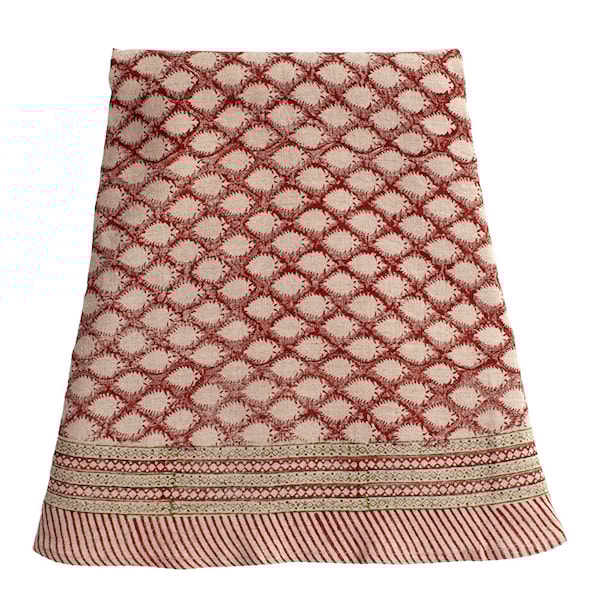 Mönstret är framtaget med indisk blockprintteknik där varje tryck görs för hand. Resultatet blir en duk som alltid är unik, med små skillnader som ger liv åt designen. Den dekorativa bården adderar en elegant inramning som gör helhetsintrycket harmoniskt.
