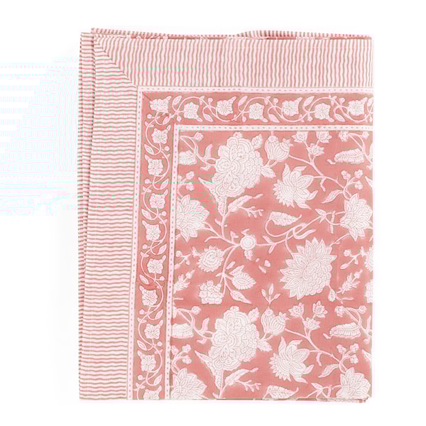 Mönstret är tryckt för hand med den traditionella blockprinttekniken från Indien, vilket gör varje duk unik och livfull.