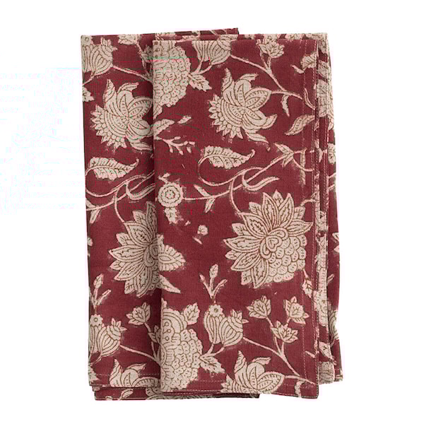Skapa en inbjudande dukning med Indian Rose linneservetter 2-pack från Chamois. Servetterna mäter 50x50 cm och är tillverkade i 100% linne med ett handtryckt mönster, skapat med traditionell indisk blocktrycksteknik. Varje servett är unik och ger bordet en varm och levande karaktär.