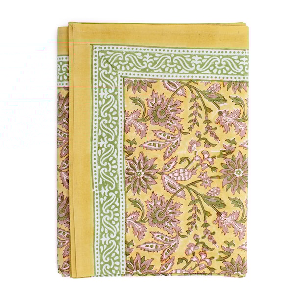 Skapa en inbjudande och färgsprakande dukning med Indian Summer duk 170x270 cm från Chamois. Denna duk är tillverkad i mjuk bomull och pryds av ett livfullt mönster som framställts med traditionell indisk blockprintteknik. Varje tryck appliceras för hand, vilket ger en personlig och genuin känsla.