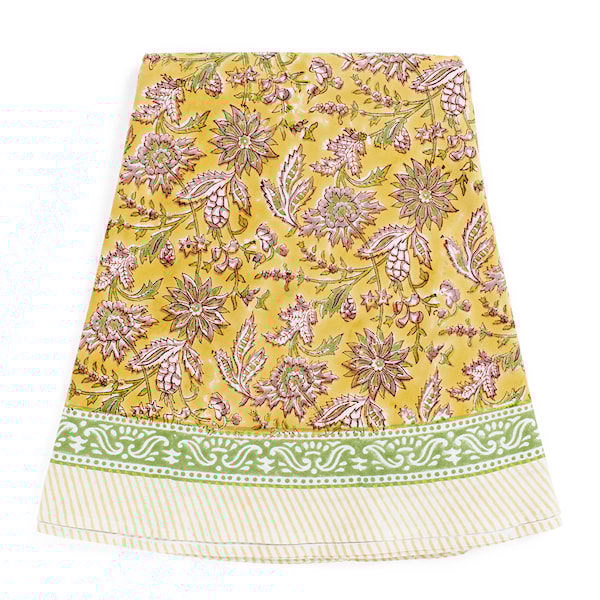 Denna runda bomullsduk pryds av ett organiskt mönster i glada färger, handtryckt med den klassiska blockprinttekniken från Indien. Varje duk är ett unikt hantverk som ger ett levande och personligt uttryck.