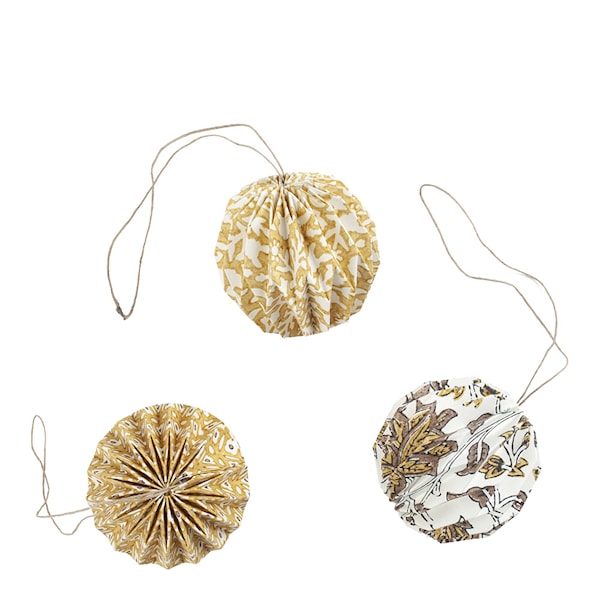 Skapa en festlig atmosfär med dessa vackra julkulor från Chamois. Detta set innehåller tre dekorativa kulor med olika mönster som kompletterar varandra perfekt. Tillverkade av papper från återvunnen bomull och handtryckta med traditionella indiska blocktrycktekniker, är varje kula unik och ett resultat av genuint hantverk.