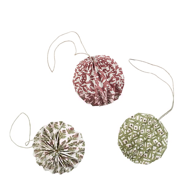 Skapa en festlig atmosfär med dessa vackra julkulor från Chamois. Detta set innehåller tre dekorativa kulor med olika mönster som kompletterar varandra perfekt. Tillverkade av papper från återvunnen bomull och handtryckta med traditionella indiska blocktrycktekniker, är varje kula unik och ett resultat av genuint hantverk.