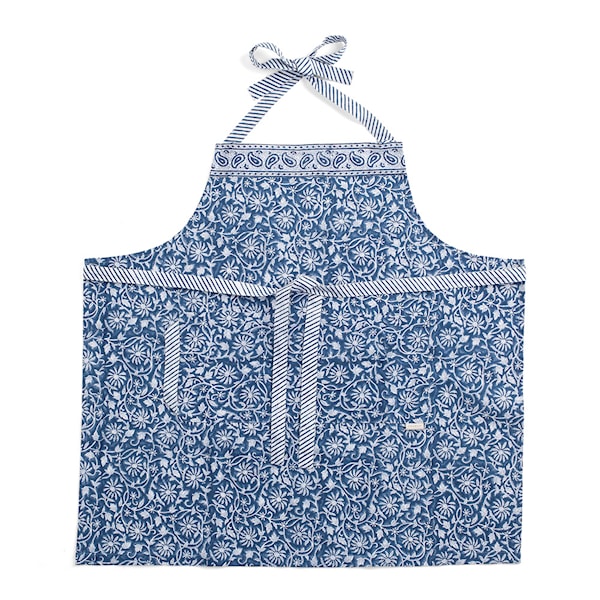 Margerita förkläde från Chamois i one size är ett vackert och praktiskt bomullsförkläde. Utrustat med praktiska fickor, kombinerar detta förkläde funktionalitet med stil. Mönstret är omsorgsfullt tryckt för hand med traditionell indisk blockprintteknik, vilket resulterar i ett unikt hantverk som ger tyget ett levande och dekorativt uttryck. Perfekt för att tillföra en touch av elegans till din köksutrustning, samtidigt som det skyddar dina kläder under matlagningen.