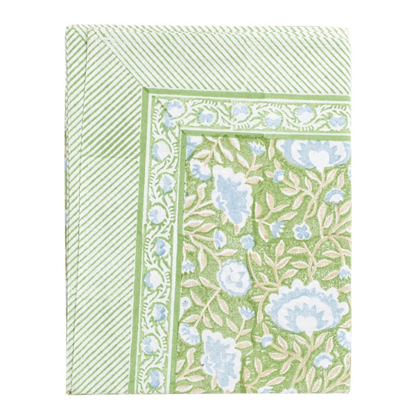 Chamois Mathilde duk 170x270 cm grön/blå/beige är en handtryckt bordsduk i bomull med ett livfullt men välavvägt mönster. Den traditionella indiska blocktryckstekniken ger varje duk ett unikt utseende och en tydlig känsla av genuint hantverk.