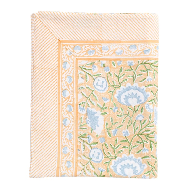 Chamois Mathilde duk 170x350 cm orange/blå/grön är en handtryckt bordsduk i bomull med ett livfullt mönster och tydlig känsla av genuint hantverk. Den traditionella indiska blocktryckstekniken ger varje duk ett unikt utseende med dekorativa detaljer och naturliga variationer.