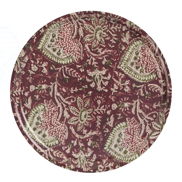 Oriental rund bricka 31 cm röd från Chamois. Klassisk rund bricka med dekorativt mönster i flera färger. Vacker ensam, men passar också utmärkt tillsammans med textilier från CHAMOIS. Chamois samarbetar med småskaliga och familjeägda fabriker i Indien, ett klockrent val för den som vill ha både stil och kvalité. De erbjuder utöver dukar, även kökshanddukar och servetter. Bara att mixa och matcha för att skapa en personlig dukning, både inomhus och utomhus.
