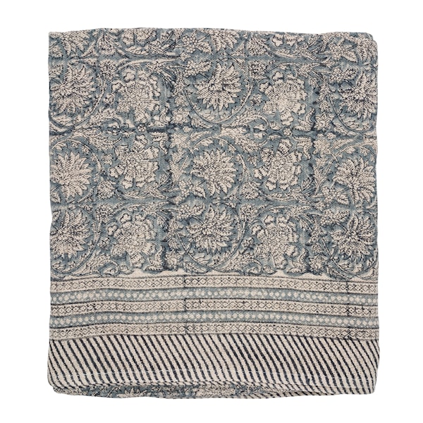 Mönstret är tryckt med den indiska tekniken blocktryck, där varje del av mönstret trycks för hand. Det utförs av skickliga hantverkare, och ger duken ett levande och dekorativt uttryck.