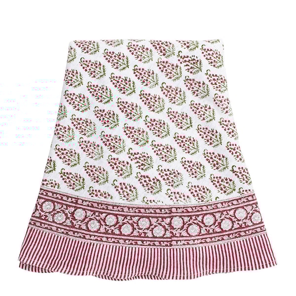 Mönstret i rött, grönt och vitt är tryckt för hand med indisk blockprintteknik, vilket gör varje duk unik. Den dekorativa bården ramar in designen och förhöjer helhetsintrycket.